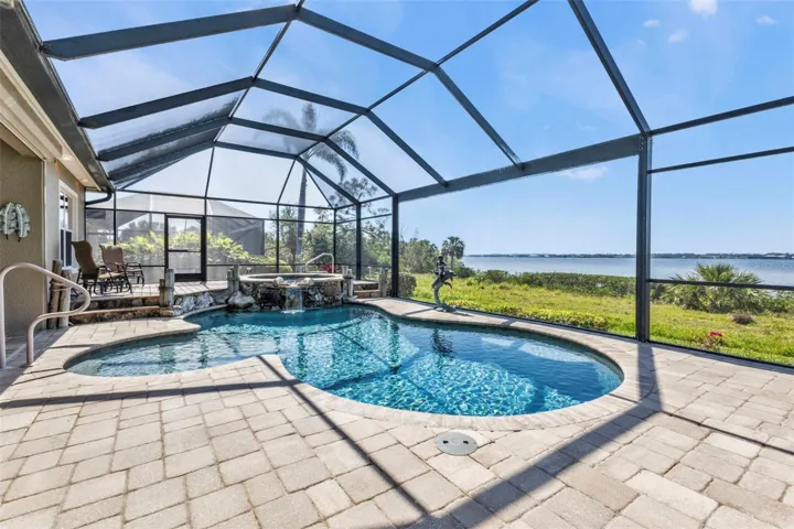 Breathtaking views of the Myakka River set the stage for this beautifully designed 3-bedroom, 2-bathroom home plus office, featuring a new roof and impact windows for added peace of mind. Inside, 10-foot ceilings enhance the spacious feel, while a mix of ceramic tile and carpet flows throughout the open, split floor plan, adding both style and comfort. Pocket sliders from the family room and kitchen lead to the expansive lanai, creating effortless indoor-outdoor living. kitchen is well-appointed with stainless steel appliances, granite countertops, rich solid wood cabinetry, a tile backsplash, breakfast bar, breakfast nook, and pantry—a beautiful and functional space for casual dining and entertaining. The primary suite is a retreat of its own, featuring tray ceilings, private lanai access, double sinks, a large tiled walk-in shower, water closet, and a spacious walk-in closet. Two guest bedrooms share a full bath, providing comfort and convenience for family and visitors. A custom office adds character to the home, showcasing a dramatic entrance with beautifully crafted wood and glass pocket doors, a transom window, built-ins, and a wood chair rail, making it an inspiring space for work or creativity. Step outside to the spacious lanai, where the soothing sounds of the waterfall spa invite you to relax. A brick patio surrounds the heated saltwater pool, while the spa’s stunning stone exterior and Trex decking provide additional space for entertaining. Unwind in the evenings as you take in the spectacular sunsets. An electric roll-down shutter offers added convenience and peace of mind. Additional features include a new hot water heater and an oversized 2-car garage. As part of the vibrant Riverwood community, residents enjoy amenities such as a par 72 championship golf course, a state-of-the-art fitness center, a resort-style pool, pickleball courts, and Har-Tru tennis courts. Beyond your doorstep, relish easy access to world-class fishing, boating, dining, shopping, and the sandy beaches of the Gulf. Conveniently located between Sarasota and Ft. Myers on Florida’s West Coast, this home offers an exceptional lifestyle in a breathtaking setting. Don’t miss your chance to make this stunning home yours—schedule your private showing today!