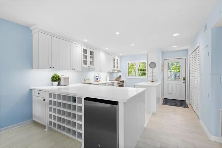 You will fall in love the moment you enter this rarely available FIRST FLOOR WATERFRONT condominium located in award-winning community Pelican Cove in beautiful Sarasota, Florida! Lovely fully renovated 2 bedroom, 2 bathroom, with a study/office just off the master bedroom with breathtaking water views of the harbor basin. You will enjoy entertaining in this open floor plan that is light and bright. The stunning kitchen boasts shaker cabinetry with lots of drawers and pull outs, attractive Corian countertops, stainless appliances, built in wine rack, and three refrigerators. Master bedroom en suite features two custom closets, one which is a large walk-in, and tastefully renovated bathroom with exquisite finishes includes an enclosed shower. This impressive condo has plantation shutters, sliding impact resistant glass doors, large wood deck overlooking the harbor, tile and laminate floors throughout, brand new water heater, and is offered furnished. Pelican Cove has a 24-hour gated and staffed entrance, renowned for it’s resort-like amenities including an 87-slip boat harbor with over 130 kayak/canoe storage rack & launch docks, fishing docks, 6 heated swimming pools, hot tub, fitness center, four lighted tennis and pickleball courts (8 pickleball courts in all), basketball, 5.5 miles of nature trails and boardwalks, and dog walk areas. The community offers loads of social activities including several yearly jazz and cultural concerts plus a few harborside concerts, clubs and classes featuring an art studio, pottery, huge wood working studio, sculpting, and classes at Pelican Cove University. There are 37 plus clubs including culinary arts, active yacht club, Tai Chi, yoga, water exercise, biking, photography, fiber art, tennis, and card playing clubs. Conveniently located to Siesta Key Beach, downtown Sarasota, restaurants, shopping, cultural attractions, hospitals, airports, and so much more.