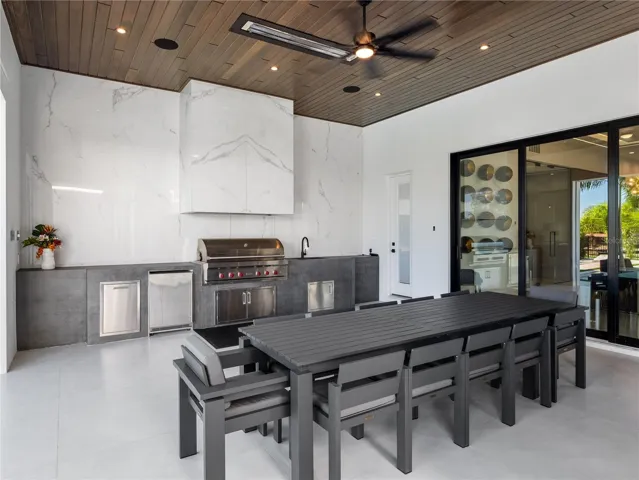 Outdoor living reaches new heights with a resort-style lanai featuring Infratech heaters, outdoor fireplace, and dual fire pits — one in the cabana and another built into the pool. Enjoy an outdoor kitchen with a 54” Wolf BBQ grill, under-counter refrigerator, and ice maker, plus a cabana bar with ice trough and beverage fridge. The outdoor theater and sound system create the ultimate setting for movie nights under the stars, enhanced by custom landscape lighting and Artistic Shellock pavers surrounding the pool deck.