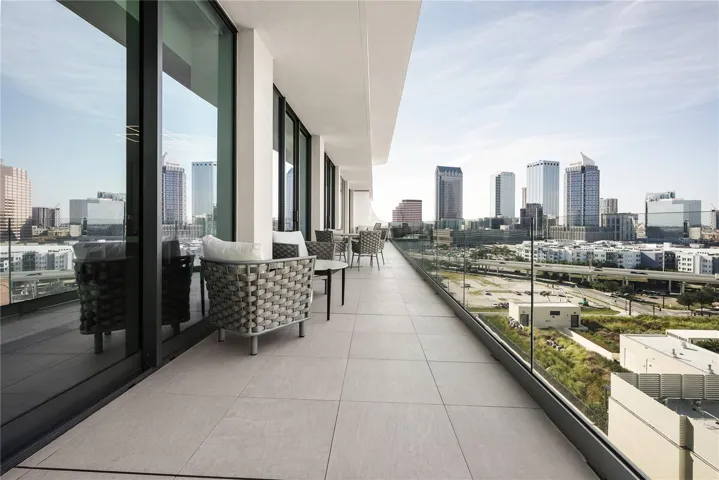 floor-to-ceiling windows that frame breathtaking views of water street and the downtown skyline. Sliding glass doors open onto