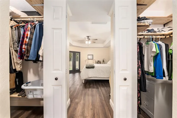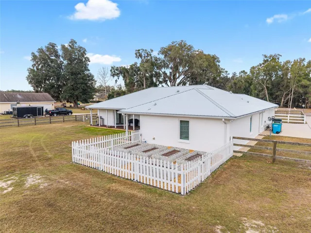 A crisp white single-story profile rests quietly against a backdrop of lush greenery and mature trees, offering a sense of privacy and calm while remaining just minutes from the Springs. Set on a generous, fully fenced lot, this move-in-ready single-family home balances serenity with thoughtful modern upgrades designed for lasting comfort and peace of mind. Recent improvements include a brand-new metal roof (2022) and all-new energy-efficient windows and exterior doors, creating a solid foundation for low-maintenance Florida living. Additional enhancements such as a newer electric water heater (2024), water softener, GenerLink generator hookup, rain gutters, and fresh interior and exterior paint underscore the home’s exceptional level of care and preparedness. Inside, rich deep-tone plank flooring anchors the home with warmth and elegance, creating effortless flow from room to room. The entry opens into a refined dining space where tailored plantation shutters filter natural light and a modern chandelier sets a confident, design-forward tone. Nearby, the main living room unfolds beneath a coffered tray ceiling, bathed in light and framed by glass doors that lead to the backyard—open and expansive, yet inviting moments of connection and pause. A second living area adjoins the kitchen, offering flexibility for entertaining, media use, or a quiet retreat. The custom chef-inspired kitchen is both stylish and enduring, featuring granite countertops, clean white cabinetry, a vented cooktop, convection oven, brand-new dishwasher, stainless steel appliances, and a farmhouse-style sink. Thoughtful details include concealed appliance storage, generous prep space, and a breakfast bar peninsula that naturally encourages gathering. A petite eat-in nook with direct yard access enhances everyday living and indoor-outdoor flow.