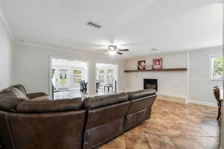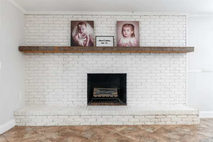 Inside, this 4-bedroom, 2-bath home offers a flexible layout ideal for multi-generational living, guests, or working from home. Crown molding flows throughout, and two separate living areas provide room to spread out — one anchored by a cozy electric brick fireplace, the other ideal as a living and dining combination. The oversized kitchen delivers abundant counter space, a breakfast bar, and a gas range for everyday living and entertaining.