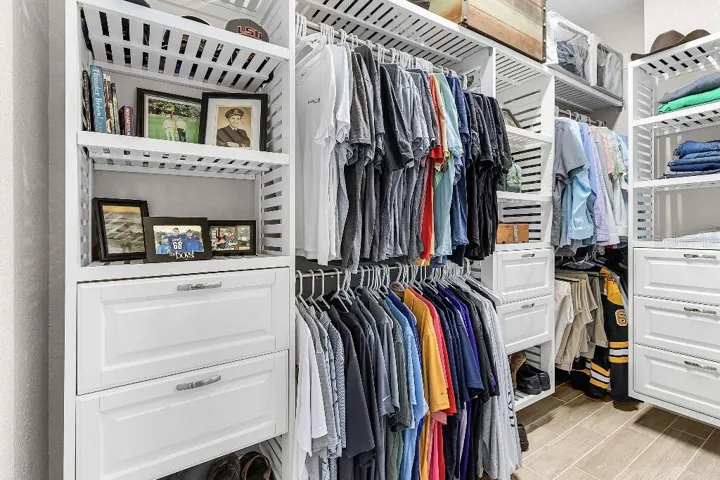 Inside, the home features three bedrooms and two and a half bathrooms, with a split-bedroom floor plan providing privacy for guests. The primary suite is a true retreat, boasting two oversized walk-in closets with custom shelving and drawers.