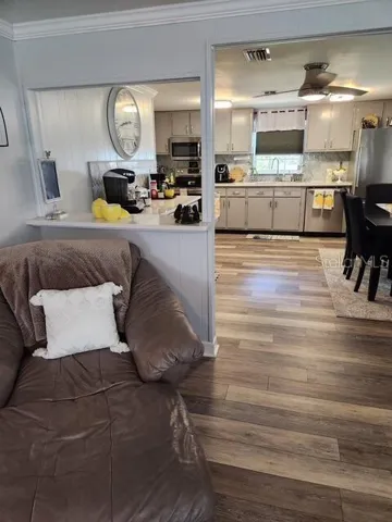 Fully remodeled, immaculate single family 2 bedroom/1 bath house on corner lot across from canal, with front porch and covered metal carport. Kitchen has been updated with quartz countertops, stainless steel appliances, and a wine cooler/coffee bar. Large laundry room off of second entryway. Levolor blinds and waterproof flooring throughout the house. New windows and doors with keyless entry. The metal roof was replaced within the last 5 years, and a new AC unit installed in 2024. Pump house and storage shed included. House is located in Pt Pleasant, between the towns of Ft. McCoy and Salt Springs. Located within 2 miles of public boat ramp. Ocala and Daytona Beach are just a drive away!