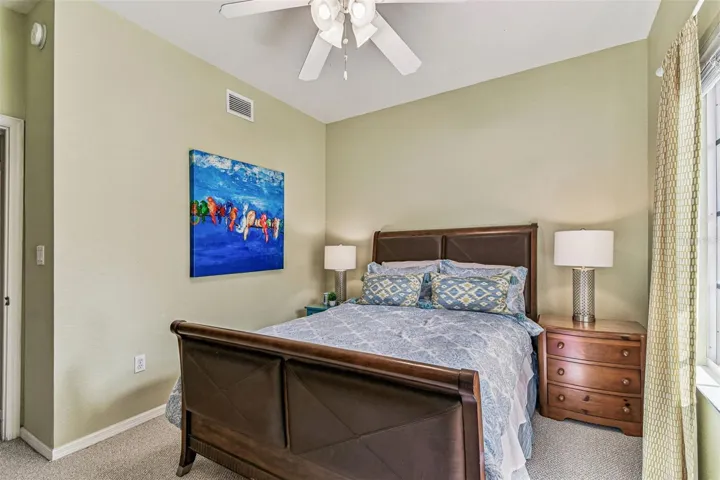 The third floor showcases the luxurious primary suite, complete with a private ensuite bath, a walk-in closet, and elegant French doors opening to a serene balcony with tropical views of the lushly landscaped grounds and resort pool. The second ensuite bedroom on this floor features another spacious closet and an abundance of natural light.