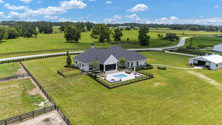 Just minutes from the World Equestrian Center and Golden Ocala Golf & Equestrian Club, this extraordinary 2023-built estate presents a rare convergence of modern architectural elegance and world-class equestrian functionality, all set across nearly 11 impeccably manicured acres behind private gates. Designed for the discerning equestrian, the property features a professional 105′ x 150′ riding arena with premium clay footing, four spacious barn stalls, an air-conditioned tack room, and dual wash racks, all thoughtfully positioned for efficiency, comfort, and horse welfare. Fully fenced and irrigated pastures and paddocks with water throughout provide an ideal environment for training, turnout, and long-term care, while two gated entrances ensure privacy, security, and seamless access for trailers and service vehicles.