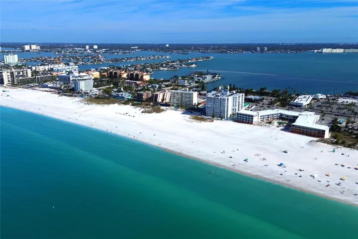 With 270-degree views of the Gulf of Mexico and Boca Ciega Bay, this seventh-floor condominium is a beach lover’s dream! Every detail of the 2017 remodel was professionally curated and has completely transformed the unit into an open floor plan with top-of-the-line finishes and appliances. The redesign of this luxurious space added trey ceilings with dimmable recessed lighting, travertine flooring throughout, shiplap accent walls, a farmhouse sink, built-in kitchen grill, wine refrigerator, Hunter Douglas automatic blinds, a smart thermostat for the new air-conditioning unit, hurricane-impact windows with exterior retractable shutters, a California primary bedroom walk-in closet and more. The complex offers an assigned private, detached garage and a storage closet for this unit in addition to the spectacular beach-front amenities, which include a chlorine pool, palm tree-shaded courtyard, outdoor grilling area, shuffleboard courts, two recreation rooms, a pool table and an outdoor shower for residents returning from the beach. This building has passed its milestone inspection and is the ideal vacation home for anyone ready to just move in, kick back and relax.