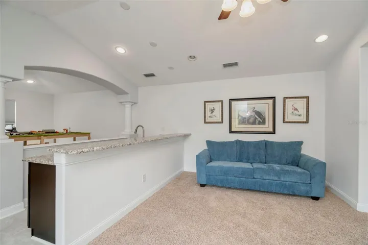 Upstairs, a loft with wet bar, mini fridge, and half bath provides versatile living space for entertaining or relaxing.