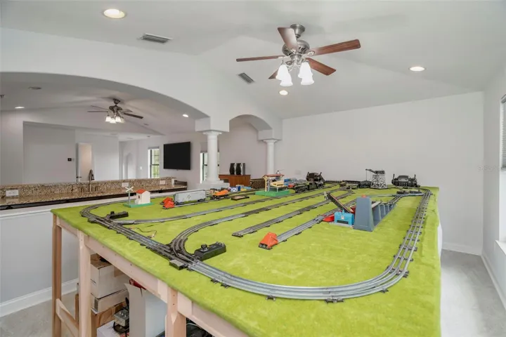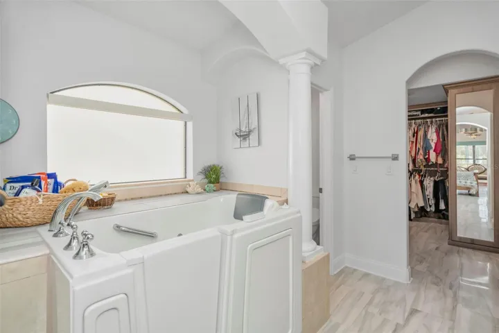 The primary suite offers a serene retreat with a sitting area, lanai access, and a spa-style bath with a jacuzzi tub, walk-in shower, and double vanities. The custom cedar-lined walk-in closet is truly impressive, with hidden jewelry storage, valets, display windows, hamper bins, and plenty of adjustable shelving.