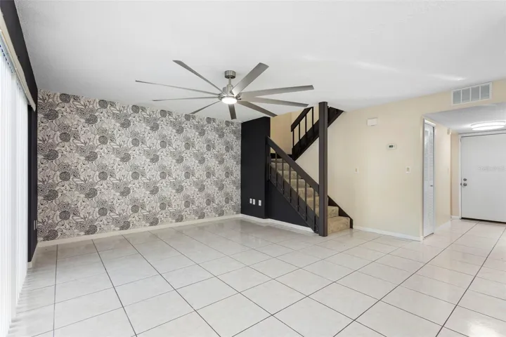 Straight ahead, the dining and living areas flow seamlessly together and extend through sliding doors to the private back porch an inviting space for gatherings or relaxation. The living room is highlighted by a new oversized 84-inch ceiling fan, adding both style and comfort.