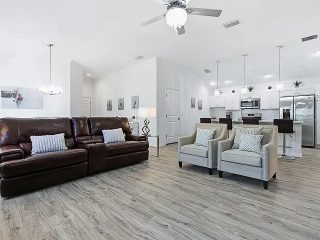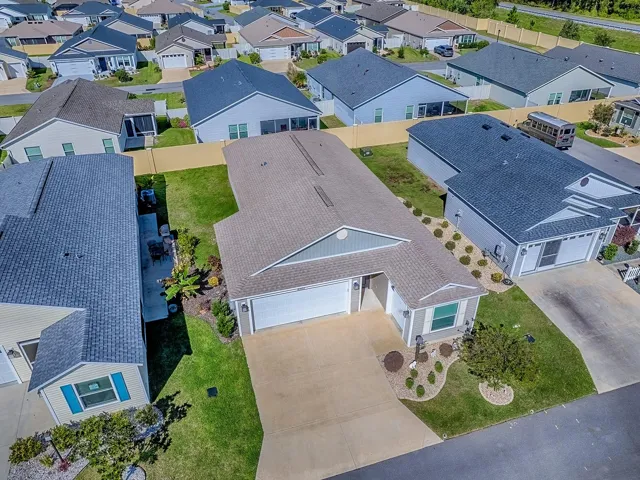 Welcome to Gale Lane, nestled in the heart of the charming Village of DeLuna! This beautifully designed Emerald 3 model offers 3 bedrooms, 2 baths, and an inviting open floor plan with vaulted ceilings and custom-crafted crown molding throughout. The dream kitchen is the centerpiece of the home, featuring white cabinetry, a spacious island, quartz countertops, pendant lighting, and stainless steel appliances — perfect for both everyday living and entertaining. The primary suite provides a relaxing retreat with a large walk-in closet, dual sinks, and a walk-in shower. Step outside to the private side patio, ideal for cookouts or enjoying Florida’s sunshine with family and friends. Additional features include a 2-car garage plus a golf cart garage, offering plenty of storage and convenience. Located just a golf cart ride away from Brownwood Paddock Square, Edna’s on the Green, and Magnolia Shopping Plaza, you’ll love the easy access to dining, entertainment, and shopping. Nearby, the Water Lily Recreation Center offers a family pool, outdoor exercise equipment, billiards, gathering rooms, and more. And for the golf enthusiast, the Lowlands Executive Golf Course is just minutes away. Experience all that The Village’s has to offer — vibrant living, endless recreation, and a true sense of community.