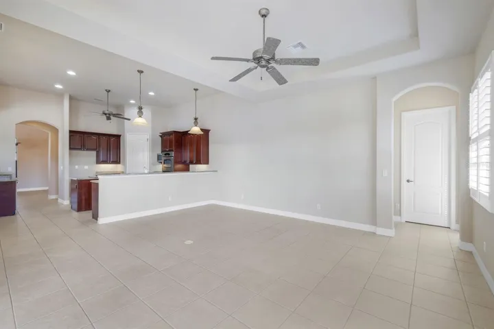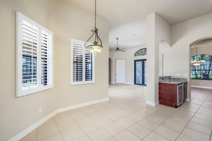 The Chef’s kitchen features double ovens, a cooktop, a walk-in pantry, and a breakfast bar that opens to the family room, overlooking the lanai and pool area. Elegant tray ceilings, and architectural details elevate the home’s interior appeal.