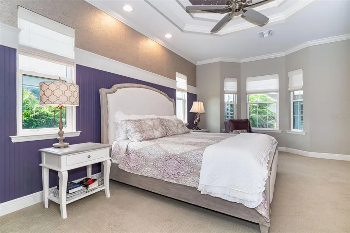 The expansive great room serves as the centerpiece of the home, featuring a custom-designed feature wall with built-in cabinetry and shelving. Intricate ceiling details grace the great room, entryway, primary suite, and cabana bedroom, while crown molding and custom beadboard accents enhance the home’s refined coastal style.