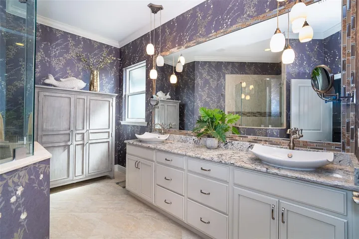 The luxurious primary suite is a serene escape, complete with custom wall treatments, spa-inspired finishes, a private water closet, and a frameless glass shower. Two additional bedrooms—including a private-entry cabana suite—offer comfort and privacy for family and guests. A thoughtfully designed laundry room adds convenience with upper and lower cabinetry, a built-in sink, and ample storage.