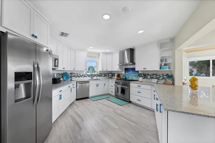 The recently refreshed kitchen is a highlight, featuring NEW APPLIANCES including a premium Wolf Duel Fuel Gas Range with Griddle, ample cabinetry, and generous counter space for cooking and gathering. With NEWER AC and STATE-OF-THE-ART HURRICANE DOORS AND WINDOWS, this home offers peace of mind and year-round comfort.