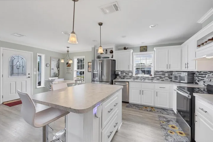 The bright, open floor plan welcomes you with high ceilings, abundant natural light, and luxury vinyl plank flooring throughout. The spacious kitchen with center island opens effortlessly to the living and dining areas, making it ideal for entertaining or relaxed everyday living. Start your mornings or unwind in the evenings on the charming front porch, a favorite feature you’ll appreciate year-round.