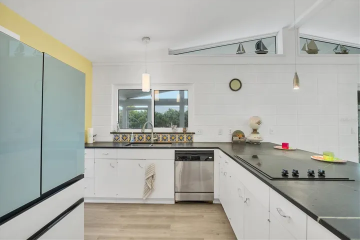 The updated kitchen features soapstone countertops, stainless steel appliances, and a bright coastal palette, creating a stylish and functional hub for cooking and entertaining.