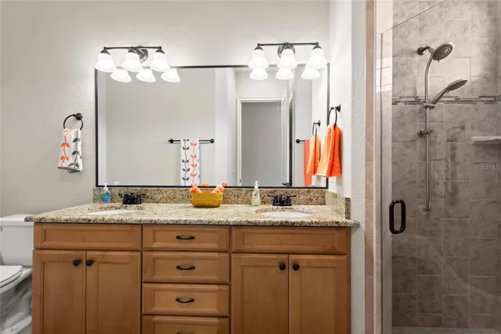 OTHER ENHANCEMENTS include elegant Plantation Shutters and upgraded Porcelain tile flooring throughout, All American Leaf Guards on all gutters with underground drainage, awning canvas newly replaced 2025, high-intensity LCD lighting in RV garage, and a WiFi-enabled sprinkler controller system for remote access, motorized Sun Shades, and motorized Storm Shutters. The beautifully manicured lot offers curb appeal and boasts a long 45-foot driveway leading to an impressive 16×54 RV garage with complete hookups (water, sewer, 50 AMP electric, and cable/dish), a deep 30-foot garage with a convenient half Bath, and enclosed carport – all providing the perfect setup for your motorhome lifestyle.