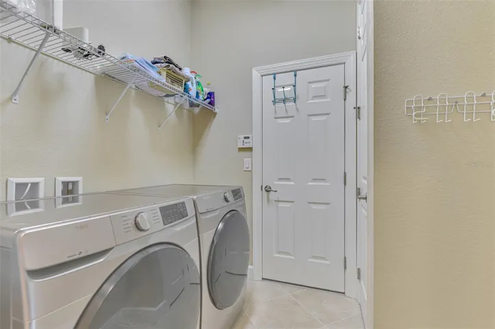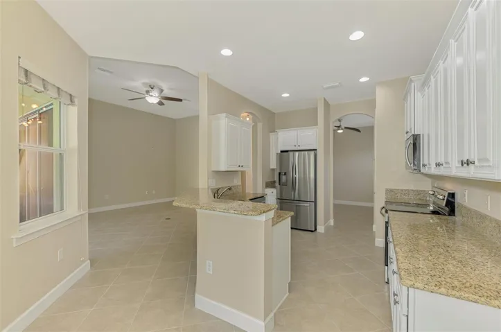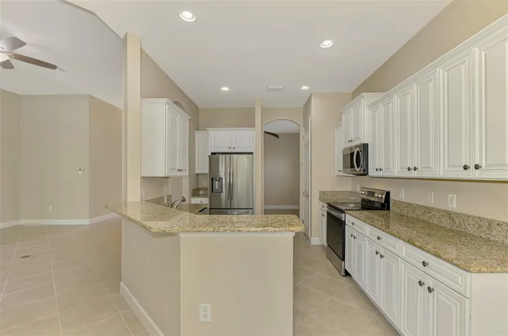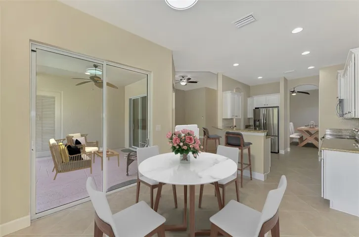 This home has numerous FEATURES AND UPDATES that enhance Florida living with style and function: Pavers on Driveway and Walkway. Energy Efficient THERMOPANE WINDOWS. 8-FOOT DOORS. Upgraded window blinds. Designer Ceiling Fans & Lights throughout. (1/2019) hurricane roll down screen at front entry. Accordion hurricane protection at all other windows. CERAMIC TILE FLOORING throughout, except for Den and Guest Bedrooms. (9/2018) Porcelain plank tile flooring in Primary bedroom. (9/2018) Kitchen and Bathroom cabinets/vanities painted. (10/2025) New Overhead Garage Opener. (7/2020) New SS APPLIANCES.
