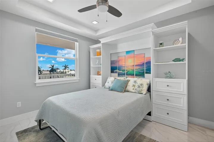 Inside the condo is well appointed with high-end coastal furnishings, plush sectional, quartz counters and stainless appliances in the kitchen, tray ceilings, designer touches throughout. TWO COVERED assigned parking spaces plus a private storage unit add everyday convenience. The spacious guest bedroom is thoughtfully designed with a comfortable queen Murphy bed that folds away effortlessly to create a versatile bonus space, perfect for visiting family, a home office, or yoga with canal views in the guest and primary bedroom.