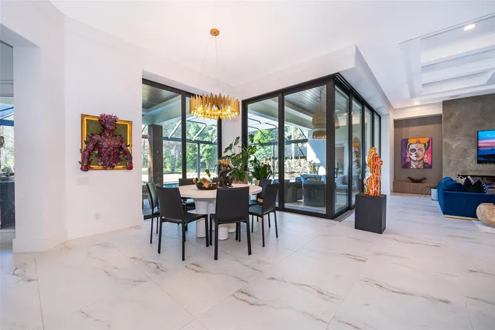 Light-filled open living spaces feature soaring ceilings, expansive 30” x 30” porcelain tile flooring, and hardwood floors throughout all four bedrooms, office, and bar areas. The chef’s kitchen anchors the home with a custom CopperSmith brass hood, oversized Dekton island, sleek custom cabinetry, and premium Monogram appliances—designed for both daily living and entertaining at scale. A fully integrated in-ceiling sound system throughout all primary social areas—including the kitchen, living room, bar, lanai, and outdoor kitchen—creates a seamless indoor-outdoor entertaining experience. An integrated wine bar with a 160-bottle dual-zone wine refrigerator further enhances the home’s hosting appeal. The primary suite serves as a private retreat with wooded views, full-wall custom cabinetry, and a spa-inspired bathroom featuring custom shower tile, LED-lit engineered wood panels, designer wallpaper, and premium countertops. Disappearing glass sliders from the great room open to a covered lanai, resort-style pool, heated spa, and summer kitchen—creating effortless flow for year-round Florida living. A dedicated home office with 16’ ceilings, custom cabinetry, and a glass-and-aluminum door provides a refined workspace. Professional landscape lighting and an extended paver driveway further elevate the home’s architectural presence.