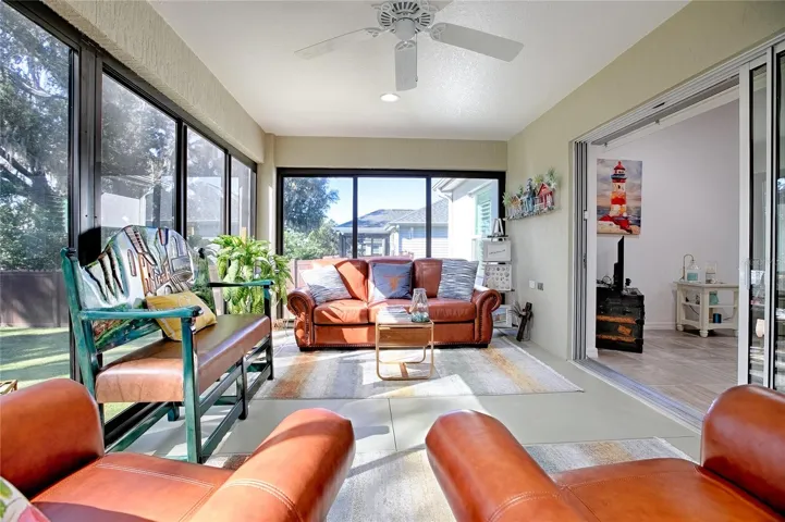 PRICE REDUCED! DON’T MISS THIS AMAZING, HIGHLY UPGRADED HOME! NO NEIGHBORS BEHIND! EXPANDED, CONCRETE BLOCK W/ STUCCO, DESIGNER HOME WITH STUNNING, REAR PRIVACY. Home is expanded: 4 feet to the garage, 4 feet on the ENCLOSED LANAI, 3 feet to the entry way and 3 feet to the front bedroom. A home like this is truly special and does not come along very often. Sellers have UPGRADED THIS HOME to the max with stunning features such as: **NO CARPET** beautiful tile in a neutral tone throughout the entire home. Custom Plantation Shutters Throughout. Need Storage? Attic is floored and offers GENEROUS STORAGE!! Gorgeous paver patios in front and back along with a paver walk way along the side of the home. Flower beds are all drought tolerant and have rocks (NO pine straw or mulch to deal with!). Beautiful, mature palms set the stage of this stunning home. Leaded glass front door with sidelight leads the way into the EXPANDED entryway. The kitchen is so nice with its’ single bowl, OVERSIZED sink and loads of counter and cabinet space. Lighting in the home was upgraded and this home shows so light and bright. Soaring ceilings give you such a spacious, wide open feeling. In the owners suite – you will love the raised vanity, custom tiled walk in ‘Roman’ style shower, private linen closet and glass block window. The walk in closet is large and will give you plenty of space for all of your clothes. There is plenty of space for large bedroom furniture. This wonderful SPLIT plan, has a guest suite behind a pocket door and an additional bedroom (all three bedrooms have large closets). The bathroom has a wonderful, custom tiled tub/shower combo and raised vanity. There is an additional linen closet in the hallway. Stepping out into your ENCLOSED LANAI, you will immediately feel the peace and tranquility of the PRIVATE backyard and NO neighbors behind. There is ALSO A SCREENED IN PORCH (‘birdcage’) to enjoy and even a stunning, custom paver patio. Vinyl fencing completes the picture. SOUTHERN EXPOSURE in the backyard allows your plants to thrive as they are never in the heat of direct sun from Eastern or Western exposure. Security System and Cameras included. There are also pull down stairs for attic storage in the EXPANDED GARAGE. This home truly has it ALL. Low Sumter County Taxes, too! Oxford Oaks has a wonderful community pool and pickleball courts, along with a tot lot/playground area. You are in the heart of all of the Villages retail and restaurants, but not in an age restricted area nor paying The Villages monthly fees. This beautiful neighborhood was built BY The Villages and you will feel the quality in this home, as well as the neighborhood.