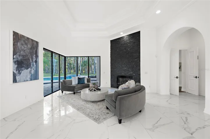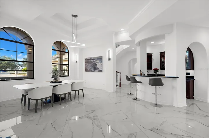 Grand double doors open to a formal living and dining area with high gloss porcelain tile flooring, tray ceilings, crown moldings, and a gas fireplace that sets an inviting tone. A full wet bar with wine cooler and refrigerator leads into a chef’s kitchen equipped with top-tier Sub-Zero, Wolf, and Miele appliances, complemented by rich wood cabinetry, exotic quartz countertops, and an extended breakfast bar. Floor-to-ceiling windows in the casual dining area showcase serene views of the pool and surrounding landscape.