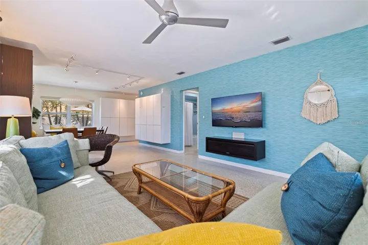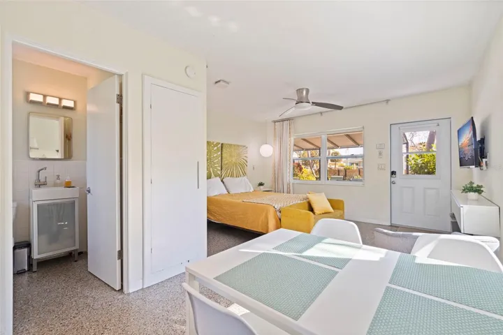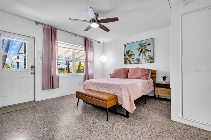 Recent enhancements to the detached unit include new sunroom windows, comprehensive interior painting, and modern lighting throughout the property. The main house bathroom has undergone a complete renovation, showcasing new tile, toilets, and fixtures. Additional updates include new ceiling fans and light fixtures that contribute to a contemporary aesthetic. Unit 1 boasts improved lighting, freshly painted walls, and updated bathroom finishes, complemented by the highly coveted terrazzo flooring. Unit 2 has been entirely renovated, featuring fresh paint, updated tile, and new completely bathroom.