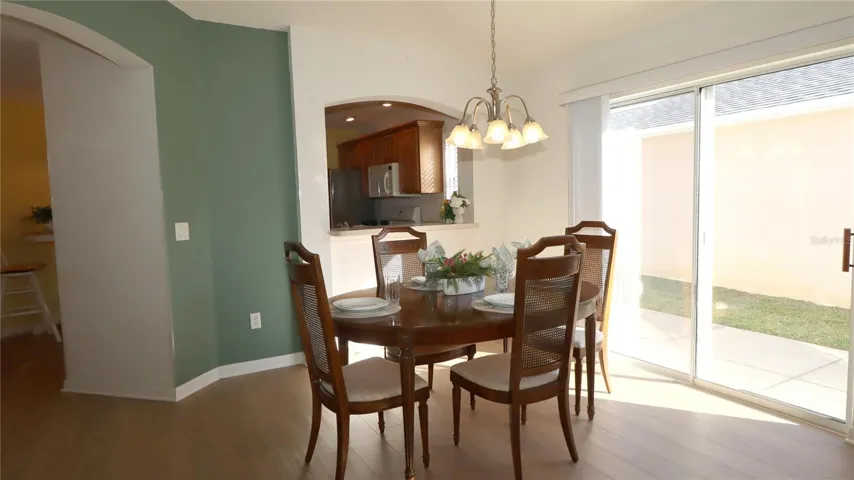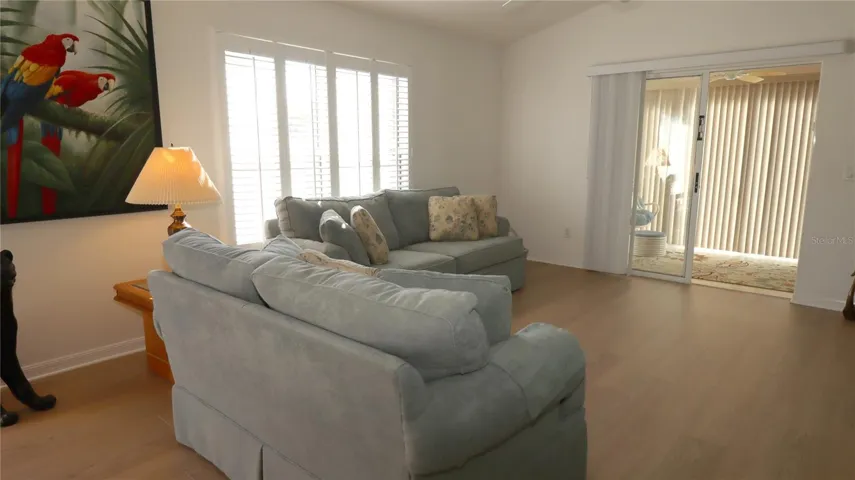 Back on the market and better than ever! Buyer had to back out because of health issues. This lovely block and stucco Beauregard courtyard Villa is located in a highly sought after Village of Virginia Trace in the Still Water Villas. You are just blocks from Sumter Landing town square. The is an all block and stucco neighborhood. This is a 2/2 with an enclosed lanai and a nice courtyard out back. The flooring is all luxury vinyl planking except the bathrooms which are tiled. Plantation shutters provide a nice look to the windows and all of the slats on the vinyl verticals have been replaced. Some furniture is included in this home and it’s ready to move right in. As you enter the home you see the kitchen with gleaming laminate counter tops. The refrigerator is 2024 and the other appliances are original. The range is gas. There is a tidy pantry in the kitchen. The garage is 1 1/2 and has the washer and dryer. There are pull down stairs for storage and flooring and a light. This open concept plan has a nice dining room with a table and 4 chairs. There are table pads and two leaves also there. The living room has a love seat and a sofa and an end table with a lamp. The Parrot picture stays as well as the panther and ducks. The Primary bedroom has a queen bed, two night stands, a corner cabinet and a dresser. The Primary bath has dual sinks and a nice step in shower. The large walk-in closet has lots of room. The guest room has room for a queen bed, and has a closet. The guest bathroom has a tub and shower combo and tile flooring. Roof 2023, HVAC 2025 (new) and Hot Water Heater 2025 (just installed). Primary bath showehas been completedly redone. There is a small bond left on this home $4.057.10, Maint $299.20 Year, Fire $320.71 Year, Bond pmt Year $486.96.