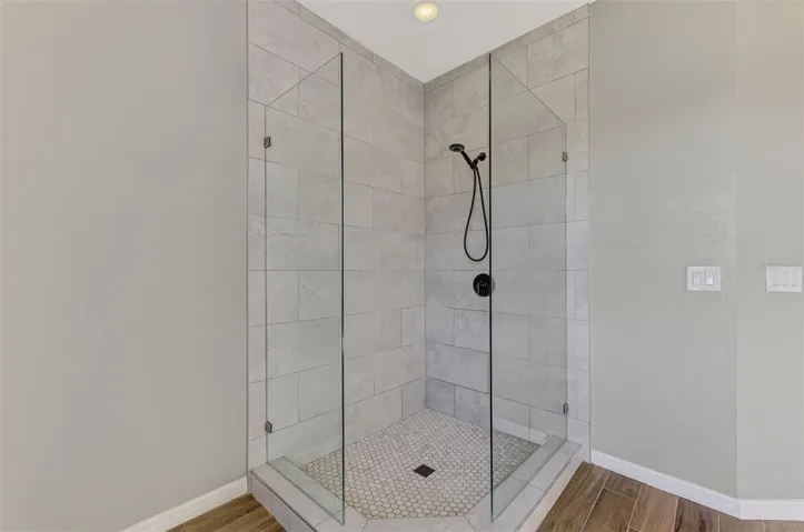The primary suite offers a spa-like retreat with DUAL SINKS and an EXPANSIVE WALK-IN CLOSET with tiled shower suite and tall glass-paneled open walls.