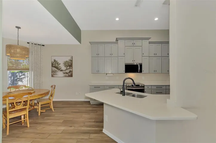 Inside, this meticulously maintained home impresses with HIGH TRAY CEILINGS, a desirable split floor plan, and bright, inviting living spaces. The large octagonal eat-in kitchen overlooks the pool and features TALL WOOD CABINETRY, QUARTZ COUNTERTOPS, and BREAKFAST BAR. The LIVING ROOM features HIGH 12-FT CEILINGS WITH RECESSED LIGHTING and sliders opening to the pool deck creating an airy, bright living space.