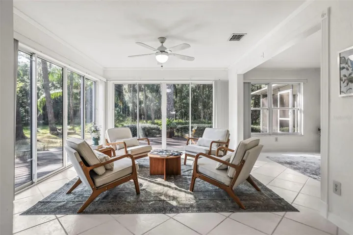 Inside, the home features tile flooring throughout, crown molding, and a cozy fireplace that anchors the main living area. The spacious layout includes a large eat-in kitchen and multiple living and dining spaces filled with natural light. Four sets of sliding glass doors—from the kitchen, dining area, and primary bedroom—open to peaceful garden and wooded views, seamlessly blending indoor and outdoor living.