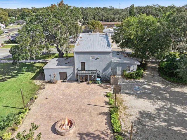 The property sits on just over half an acre (0.59 acres) and offers 13 parking spaces. There’s also a large brick paver patio area with a fire pit and electrical hookups – a great spot for gatherings or outdoor workspace. Just beyond is an additional commercial lot, about 0.25 acres, included in the sale and offering even more possibilities.