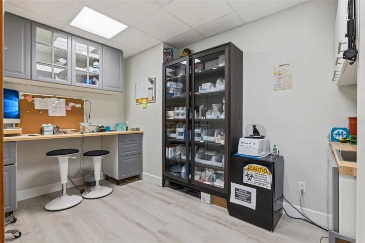 The main floor is move-in ready and is currently set up as a medical office. It includes a welcoming reception area, five exam rooms, a large flex room (Suitable for a wide range of uses, such as a conference room), a private office, kitchen, and a break room. The layout offers a lot of flexibility for different business types, and the large windows bring in plenty of natural light.