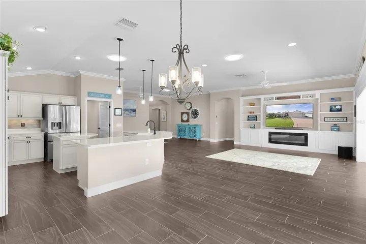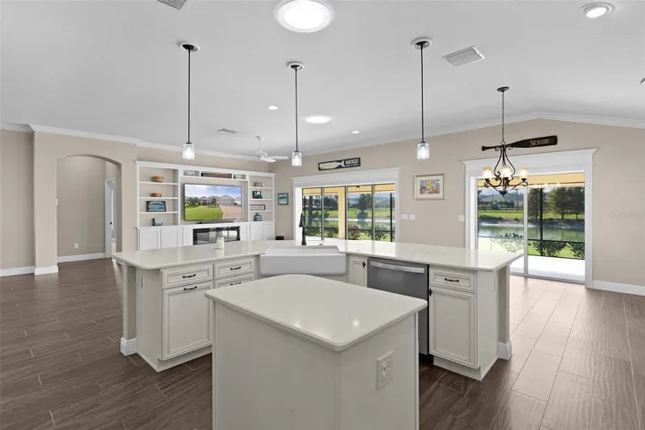 Relax and unwind in the expansive 52′ x 14′ lanai, complete with A pond view and pull-down shades for comfort. The four wall-mounted TVs convey with the home. Existing furniture is available separately.
