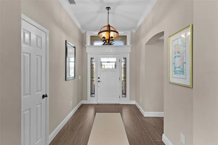 Inside, enjoy high ceilings, wood-look tile flooring, carpeted bedrooms, and tray ceilings in both the front guest room and the luxurious primary suite. The home is equipped with a Pegasus whole-house filtration system, new matching contemporary quartz countertops, pull-outs throughout the kitchen and primary closet, crown molding, built-in entertainment center with bookcases, and plantation shutters on every window. Four solar tubes—two with night lights—brighten the living spaces. The laundry room offers an additional office area and built-in cabinetry.