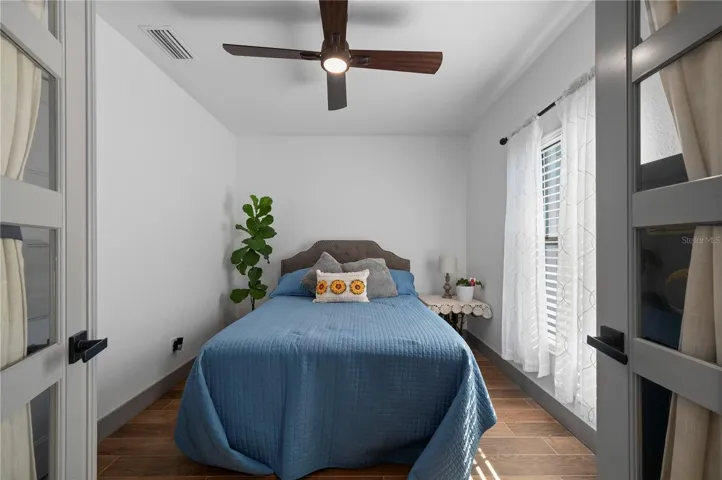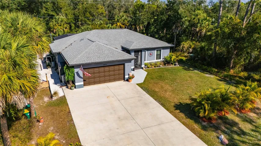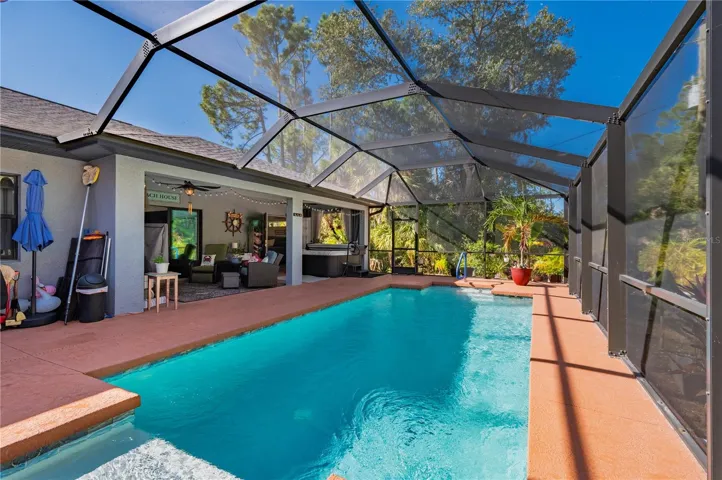 No flood insurance required! This nearly-new 2022 custom home offers 3 bedrooms, 2 baths, and a 2-car garage, 1,445 sq ft, with a strong emphasis on quality materials and seldom available ADA-minded design. The property sits on a private lot landscaped with Areca palms and Calusias, and is surrounded by nature. Inside the screened front entry, the open floor plan flows gracefully with all porcelain tile flooring, cathedral beamed ceiling, and kitchen with a distinctive gray swirl granite counter and bar featuring a farmer’s sink, upgraded fixtures, soft-close designer cabinets and a herringbone subway tile backsplash. The pantry has pull-out shelving and there are double outlets, stainless steel LG appliances and recessed lighting with a dimmer feature to complete the workspace. In the main living area, sliding glass doors open the space to the lanai and an inviting 12×24′ electric-heated salt-water pool. The large covered lanai extends the living space, and a 5-person Smokey Mountain spa is available. The pool has steps on one side and a Baja sun shelf on the other, ideal for tanning or lounging. Greenery surrounds the screened pool for privacy. French doors open from the pool area to the master bedroom or dining, and there is also pool bath access. Both baths have walk-in tiled showers, granite counters with undermounted sinks, handrails, 36″ wide doors—reflecting the custom ADA-friendly features built into the design. The master bedroom also features a tray ceiling, and upgraded fans are found throughout as are upscale designer doors. A tankless water heater provides efficiency, and the Ruud air conditioner is well-maintained and under warranty. The Whirlpool washer and dryer remain in the garage, but the entry ramps will be removed. The home is also wired for a whole-house generator, has an extra-wide driveway, and overall, the property reflects careful choices, durable finishes, and craftsmanship that favors long-term comfort and ease of living.