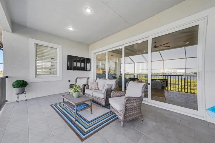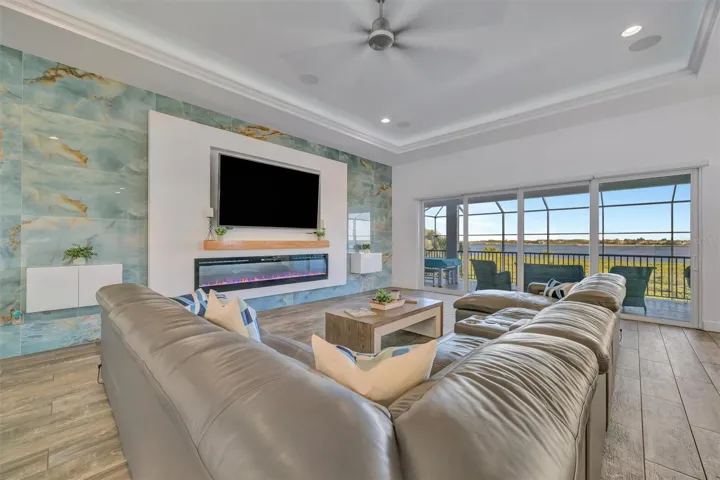 Stunning, fully updated RIVER VIEW home in the premier boating community of Tidewater Preserve! This MOVE-IN-READY 3 ensuite bedroom + den, 3.5 bath, 3-car garage, pool & spa residence offers nearly 4,000 sq ft of refined living space with breathtaking long-range Manatee River views from both levels. Freshly painted inside and out, the home showcases exceptional curb appeal with a circular driveway, METAL ROOF, split 3-car garage, HURRICANE-IMPACT windows and doors, upgraded landscaping, and an impressive double staircase that sets the tone for the luxury within. Plantation shutters enhance every room, complemented by remote-controlled blinds in the living room and primary suite. Inside, an elegant OPEN FLOOR PLAN features tile flooring throughout, soaring ceilings, designer lighting, surround sound, and a dramatic decorative tile feature wall highlighting a 96-inch fireplace. The gourmet kitchen boasts a 48-INCH stainless commercial 6-burner gas cooktop with griddle and commercial exhaust hood, CAMBRIA quartz countertops with a waterfall island, full-height Cambria backsplash, Cambria-wrapped island front, custom cabinetry, walk-in pantry, stainless steel appliances, built-in oven, and a wine cooler encased in a Cambria waterfall surround. A separate built-in bar further elevates the main living area—perfect for entertaining. The den features unique architectural appeal with three custom cutout arches with Cambria quartz sills and a built-in cabinet topped with Cambria quartz. The upper-level primary suite captures sweeping river views and includes two custom walk-in closets and a spa-like bath with double sinks, soaking tub, walk-in shower, and Cambria quartz counters and finishes. A convenient upper-level half bath is ideal for guests. The lower level offers two ensuite guest bedrooms and an additional living area—perfect for extended family, teens, or visitors seeking privacy. Both guest suites feature beautifully updated baths with matching cabinetry, Cambria quartz countertops, and quartz-framed mirrors. Outdoor living is exceptional with 36′ x 12′ upper and lower covered porches, a spacious screened pool deck, and a fully automated saltwater pool and spa. The impressive two-story panoramic screen enclosure captures unobstructed river views and includes an outdoor kitchen, safety baby gate, and exterior Ring cameras. A custom spiral staircase seamlessly connects both levels for effortless indoor-outdoor enjoyment. Tidewater Preserve offers unmatched amenities, including a private marina accommodating boats up to 32 feet, clubhouse, two fitness centers, three pools, tennis courts, kayak launch, dog park, scenic riverfront walking trails, and 24-hour guard-gated security. Red Storage cabinets in garage included.