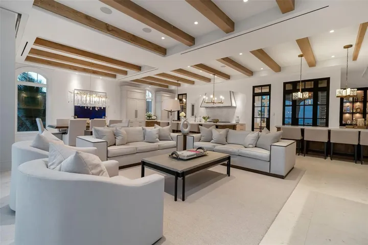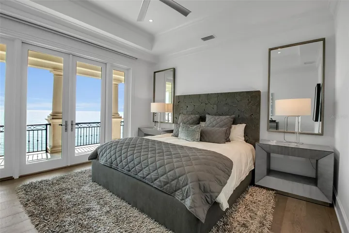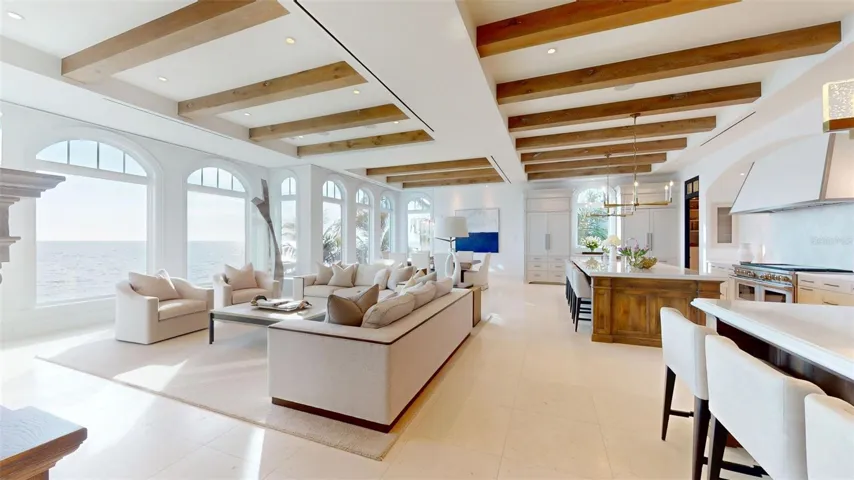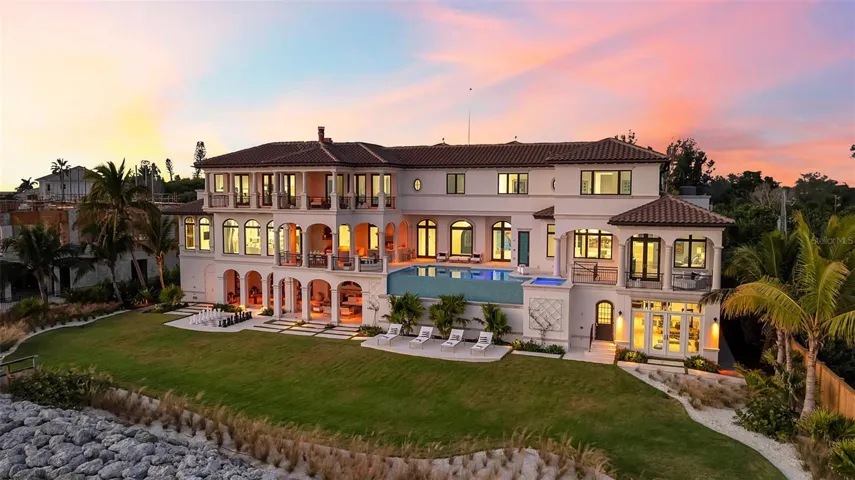 Rising above an enviable stretch of shoreline, this Gulf-front estate showcases timeless architecture and coastal refinement. Designed by CMSA Architects and completed in 2020, the residence features layered rooflines, sculpted stone staircases, and soaring arched windows across more than 180 feet of Gulf frontage. With 10,600 square feet of interiors and 20,982 square feet in total, the home offers a grand yet effortless indoor–outdoor lifestyle, ideal for both elevated entertaining and daily living. A sweeping motor court, mature palms, and a grand double staircase create an immediate sense of arrival. Inside, natural light and uninterrupted Gulf vistas establish a feeling of calm, scale, and sophistication from sunrise to sunset. The great room, lined with floor-to-ceiling arched windows and anchored by a carved-stone fireplace, delivers both serenity and architectural presence. The main kitchen is a triumph of craftsmanship – featuring custom Campbell cabinetry, quartz countertops, designer lighting, Sub-Zero refrigeration, a Wolf six-burner dual-oven range, and a substantial island that anchors the open flow into the living and dining spaces. A prep kitchen and workspace elevate functionality with premium appliances, expansive storage, quartz counters, and a dedicated gift-wrapping wall. The bar and wine room create a refined entertaining destination, defined by custom cabinetry and designer lighting. An iron-and-glass–enclosed, temperature-controlled wine room serves as the focal point, complemented by adjacent illuminated display shelving. Sub-Zero refrigeration, an ice maker, and a Fisher & Paykel dishwasher drawer complete the space. Outdoors, the estate unfolds across three dramatic tiers of Gulf-facing living, featuring arched loggias and a resort-style alfresco kitchen with a wraparound bar that opens seamlessly to the main living spaces. An elevated infinity-edge pool and spa appear to merge with the Gulf, while thoughtfully designed outdoor areas transition effortlessly to a manicured lawn and direct access to the crystal-clear waters at Point of Rocks—where snorkeling, dolphin sightings, and sunset walks become part of daily life. The primary suite forms a private wing, introduced by an illuminated groin-vault corridor that enhances the home’s architectural rhythm. Gulf views fill the bedroom and its terrace, while the bath offers a symmetrically designed retreat with dual vanities, full-height mirrors, multiple chandeliers, a massive double-entry shower, a stone-surround soaking tub, a Sub-Zero–equipped coffee bar, and two exceptional custom closets. Nearby, the office provides a quiet, light-filled workspace. The upper level is devoted to comfort and privacy, offering four well-appointed guest suites, a spacious family room with a wet bar, multiple terraces capturing Gulf views, an additional office, and a laundry room. The ground level is enhanced by indoor–outdoor walkways connecting multiple spaces and generous storage, reinforcing the effortless, resort-style livability. A generator, 3-stop elevator, 6-plus humidity-controlled garage spaces, floor-to-ceiling shades, linear vents, whole-house automation, and shellstone and French oak flooring complete the offering. A short, shaded, tree-lined walk places you at Siesta Key Beach, the No. 1 beach in America by TripAdvisor, offering effortless access to one of the world’s most iconic shorelines.