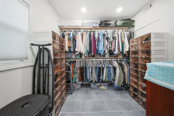 Privately positioned on its own wing, the primary suite feels like a personal retreat. Impact-rated sliders open directly to the heated saltwater pool, making indoor-outdoor living effortless. A thoughtfully expanded walk-in closet adds convenience and organization, and the suite’s location ensures privacy rarely found in homes this size.