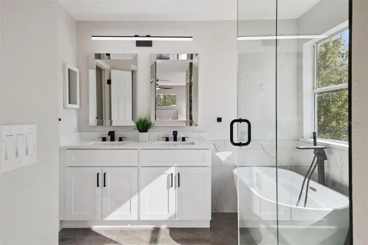 The interior features a bright open floor plan with dramatic double-height ceilings, brand-new tile flooring downstairs and durable LVP upstairs, all-new baseboards and trim, and a fully updated 2025 kitchen with stone countertops and modern cabinetry. The spa-style primary suite includes two walk-in closets, a glass walk-in shower, and a soaking tub.
