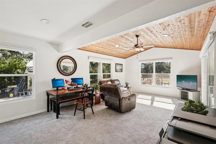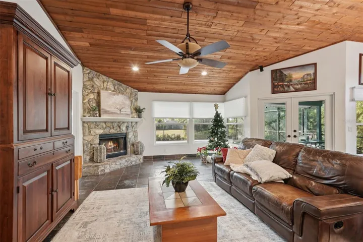 This home boasts some of the finest finishes, including slate flooring in main living areas, travertine tile flooring in the master bath, solid walnut kitchen cabinetry, tongue and groove cedar vaulted ceilings throughout the main living areas as well as the master bedroom, kitchen and family room. A standing seam metalroof, new HURRICANE impact and thermal windows (26) and exterior impact thermal doors including a double/triple slider: house qualifies for long-term insurance savings as all house openings were replaced. Two seat infrared spa in garage stays. New Bali blinds throughout-more energy savings. Wired Bose surround speakers stay.