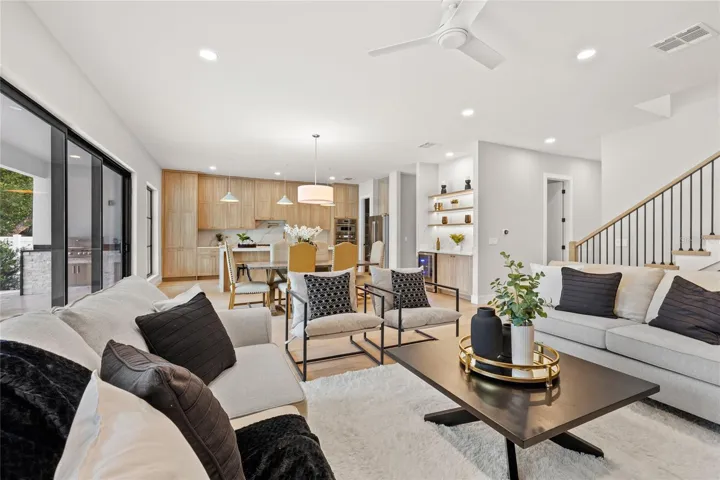 Exquisite new build featuring a statement chef’s kitchen with professional Thermador appliances, European-style cabinetry, dramatic quartz countertops, and a waterfall-edge island. The open layout flows effortlessly into the dining and living areas, where soaring ceilings, designer lighting, and large glass sliders bring in incredible natural light.