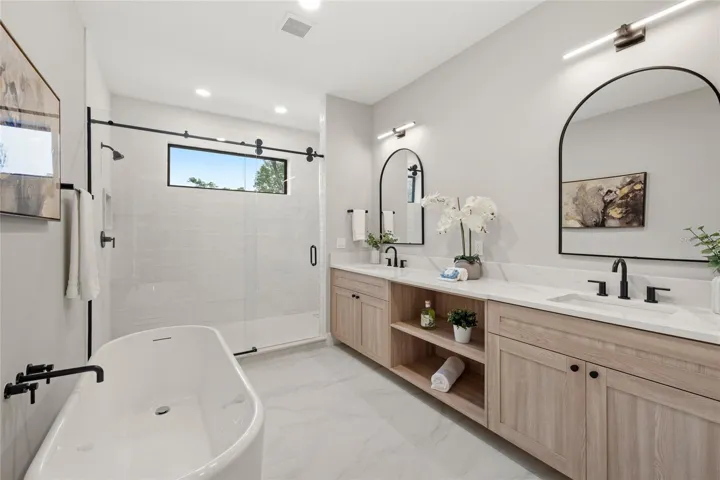 A first-floor primary suite feels like a private retreat with a spa-inspired bath, freestanding tub, oversized walk-in shower, dual vanities, and a boutique-style custom closet with LED lighting. An additional primary suite upstairs features an oversized room, walk in closet and dreamy bathroom with dual shower heads. The home also features custom millwork throughout and a sleek wet bar with built-in wine refrigeration—perfect for entertaining.