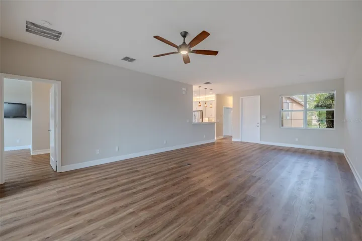 The gourmet kitchen is a true standout, thoughtfully designed for both form and function. It features solid wood cabinetry with soft-close drawers and doors, two pantry cabinets with pull-out shelving, luxurious granite countertops, a stylish glass backsplash, and a bar-height breakfast counter accented by 3 decorative pendant lights. Samsung S/S appliances include a slide-in range, 3-drawer refrigerator, microwave, & dishwasher. A casual dinette area with an 8’ window creates the ideal space for morning coffee or casual meals. The 13’x12’ dining room is highlighted by a large double window with up & down folded blinds, and it will comfortably accommodate eight. The spacious great room features a Harbor Breeze Saratoga 60” LED lighted ceiling fan and has access through 12’ sliders to the fully screened in lanai. The lanai offers the perfect space to relax, entertain, or simply enjoy the serene water view.