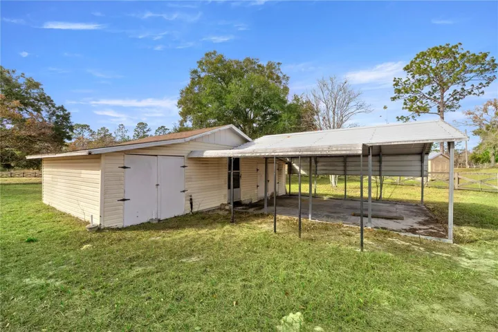 Completely remodeled – everything is new – bring the horses & toys and move right in! Super location only 15 minutes to HITS, 20 minutes to The World Equestsrian Center. (WEC), 15 min to Goethe State Forest, and 20 min to Rainbow Springs State Park. The unique style & construction of this one-of-a-kind round house maximizes the usable square feet & significantly improves energy efficiency. Constructed of concrete, concrete board & stone, and a roof constructed of approximately 12′ of concrete, this home is insulated and solid! The gorgeous, open floor plan offers an abundance of natural light and features: large living room with rounded wood burning fireplace with heatilator, spacious eat-in kitchen w/breakfast bar, pantry, granite counters, and stainless-steel appliances; master bedroom with walk-in closet and en-suite bath with walk-in tile shower; 2 guest bedrooms (one with walk-in closet, one with built-in closet); guest bath; inside laundry with storage closet; and a large covered front porch overlooking the property. This gorgeous fully fenced and gated 2.5 acres also includes a 1200 sf Quonset Hut with 360 sf carport; a 512 sq shed with carport that includes 3 separate workshops/storage areas; plus another a 360 sq ft. carport. This property backs up to a huge farm and offers gorgeous views of the surrounding properties. A gorgeous and unique opportunity to create your own mini-farm and own 2.5 acres with a completely remodeled home offering room for you, your hobbies, and your animals!