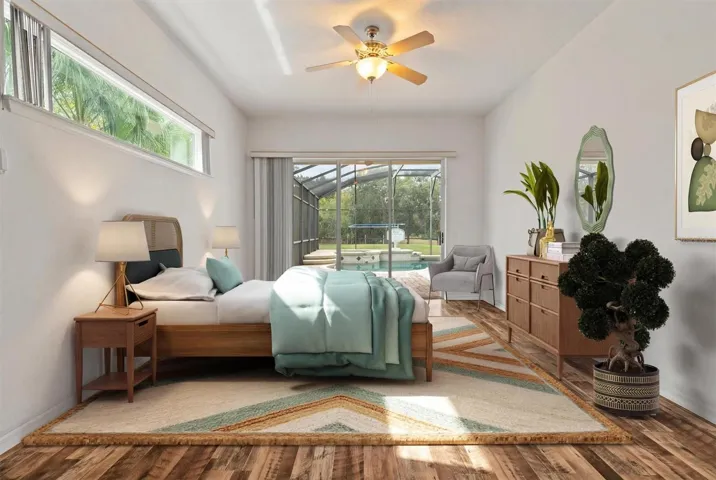 The primary suite is privately situated and features direct pool access, his-and-hers walk-in closets with custom organizers, and a spacious ensuite bath complete with dual vanities, a walk-in shower, and a soaking garden tub.