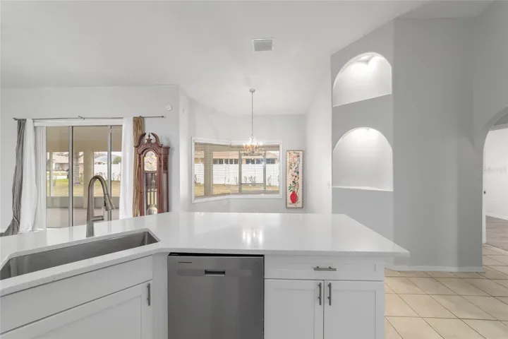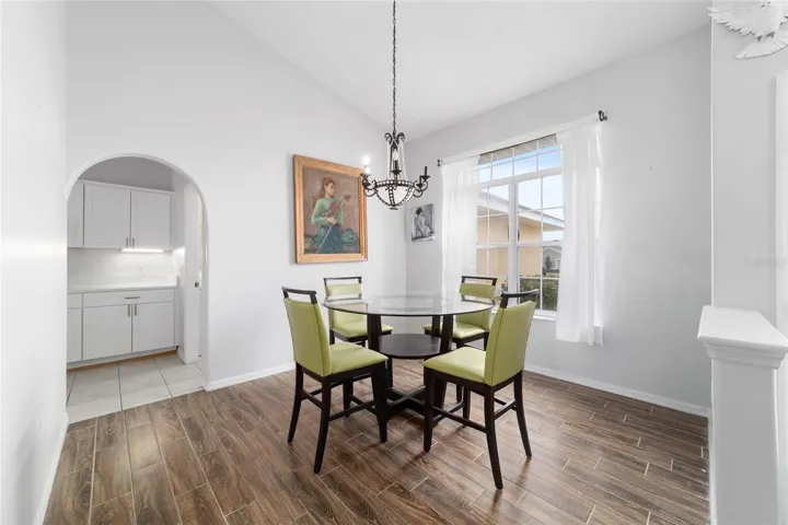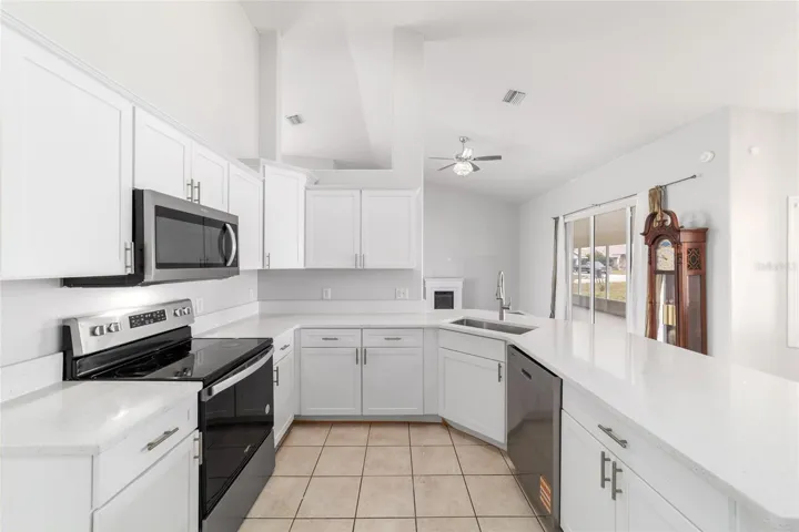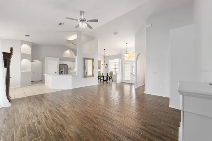 In the main living area, stacking sliding glass doors open seamlessly to a tiled lanai and screened enclosure- perfect for morning coffee or unwinding while enjoying the spacious backyard. The outdoor space is enhanced by mature landscaping, including a loquat tree and a magnolia, creating a tranquil setting.