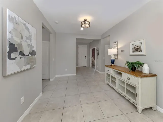 This beautifully designed three-bedroom, 2.5-bath home with a den is positioned on a corner lot offering exceptional privacy and tranquil preserve views with uplighting. An extended travertine lanai with a six-person spa creates a peaceful, romantic retreat surrounded by nature. The curb appeal is enhanced with uplighting and the welcoming entry gallery provides an ideal space to showcase art collections or create a flexible open area to suit your lifestyle. Inside, the great room plan features high ceilings with a tray ceiling and architectural accent wall, flowing seamlessly into the kitchen and dining area. The kitchen offers a counter-height bar and opens to a spacious walk-in pantry with extensive shelving, shared with the laundry room for added convenience. The primary suite is thoughtfully located at the rear of the home for ultimate privacy, featuring two walk-in closets and an en-suite bath with a walk-in shower and dual tall vanities. Two additional bedrooms are positioned toward front of the home and share a full bath conveniently between them, offering comfort and functionality for family or guests. A spacious den/office with French doors provides a quiet, light-filled space, ideal for working from home, a reading room or a flex space to suit your needs. Pocket sliders from the great room lead to the extended lanai, where the private spa setting invites relaxation and unwinding at the end of the day. Hurricane protection for all windows and doors adds peace of mind. Experience the Gulf Coast lifestyle at award-winning, resort-style community of Grand Palm. Residents enjoy 28 miles of recreational trails, the Palm House fitness center, a resort-style pool with waterslide, lap pool and spa, splash park, Adventure Playground, social club with pickleball courts, gathering spaces and cafe kitchen, plus Adventure Lake for kayaking and fishing. Additional amenities include basketball, tennis, bocce ball, volleyball courts and two dog parks. Don’t miss this opportunity to own your private piece of paradise. Schedule your showing today.