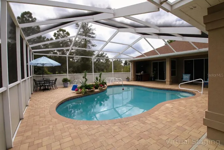 The screened lanai and pavered pool area are designed for both relaxation and entertaining, complete with a built-in outdoor grill and ceramic egg-style grill. The saltwater pool serves as the focal point of the home and extends the living space year-round.